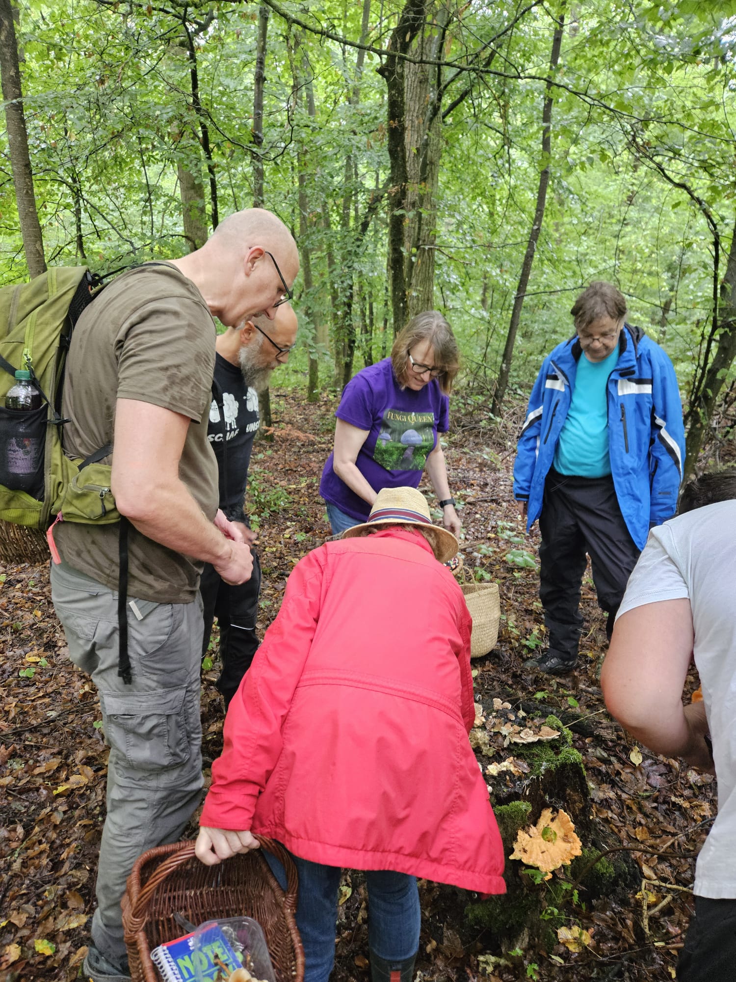 Gemeinsam oder in Kleingruppen durchstreifen wir die Gegend und tauschen uns schon an Ort und Stelle über die unterschiedlichsten Funde aus. Neben unserem Hauptthema Pilze begeistern uns auch deren Begleitpartner Bäume, Sträucher, Blumen und Kräuter.